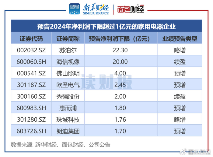 公开资料显示,18家业绩预喜家用电器企业中,苏泊尔、海信视像、佛山照明等8家企业预告净利润下限超过1亿元。