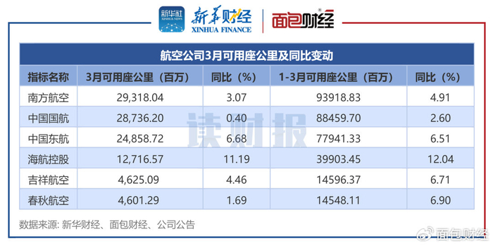 可用座公里:南方航空居首 海航控股同比增幅较大