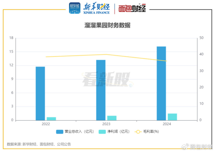 数据显示,2022年至2024年,溜溜果园的总收入分别为11.74亿元、13.22亿元、16.16亿元,净利润分别为0.68亿元、0.99亿元、1.48亿元。期间,公司毛利率分别为38.6%、40.1%、36%。