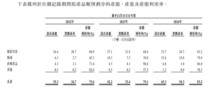 溜溜果园的梅干零食产量从2022年的2.07万吨升至2024年的2.87万吨,期间产能利用率超过80%。2024年,梅冻、西梅产品的产能利用率达到79.8%、86%,公司综合产能利用率约83.2%,近三年持续上升。