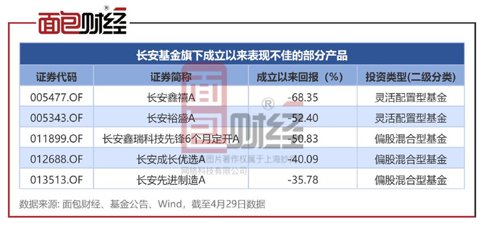 根据不完全统计,截至4月29日数据显示,除了长安裕盛A,长安基金旗下还有多只产品成立以来净值下跌超过30%,包括长安成长优选A、长安鑫禧A等。