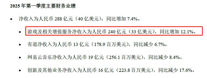 财报显示,网易2025年第一季度实现净收入为288亿元,同比增加7.4%。这是网易在连续两个季度净收入同比负增长后,重新回到增长通道。