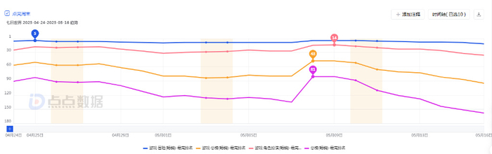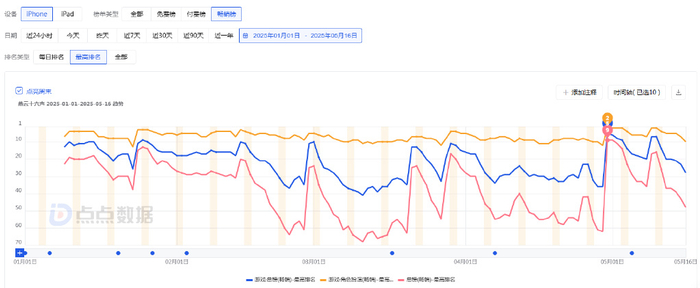 《七日世界》手游是一款超自然末日题材的多人开放世界生存游戏,于2025年4月公测上线。根据点点数据的监测,《七日世界》在中国内地App Store的游戏畅销榜排名于5月8日最高达到48名,此后有所下滑。