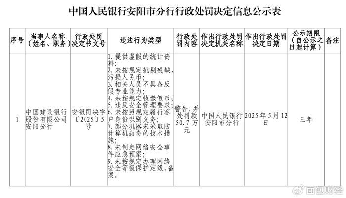 5月16日,中国人民银行安阳市分行披露了对建设银行的行政处罚信息。