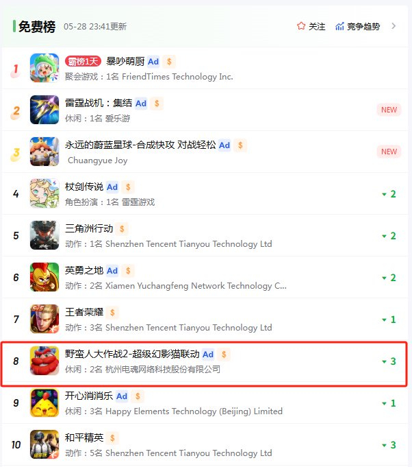 根据全球移动应用、游戏数据监测服务商点点数据的监测,5月28日上市当天,《野蛮人大作战2》在中国内地App Store游戏免费榜排名第8。