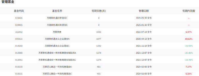 截至2025年5月30日数据(下同),束金伟任职的万家债券、万家新机遇龙头企业A、万家新机遇成长一年持有A、万家匠心致远一年持有A的任期内回报率分别为6.47%、89.63%、-20.41%、7.27%。