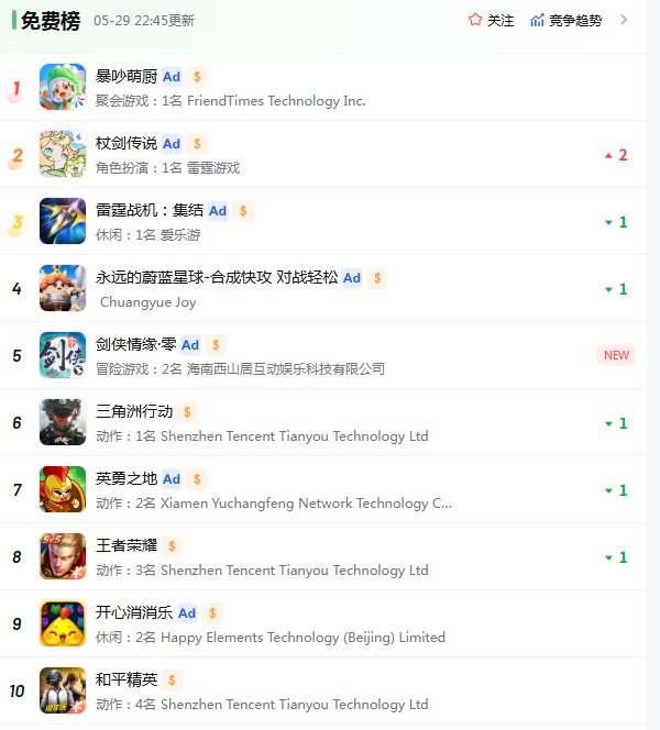 根据全球移动应用、游戏数据监测服务商点点数据的监测,5月29日上线当天,《杖剑传说》位居中国内地App Store游戏免费榜TOP2。