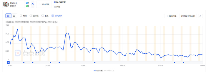 点点数据监测显示,《问剑长生》在中国内地App Store平台的流水高点为2025年1月,2月又有一次冲高,此后流水回落较为明显。