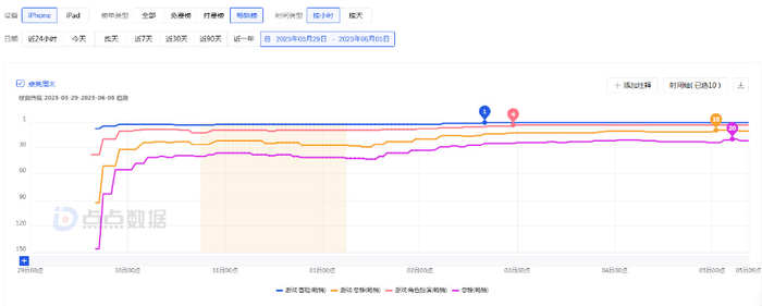 伴随玩家数量增长,《杖剑传说》在中国内地App Store平台的游戏畅销榜排名也呈上升趋势。根据点点数据的监测,6月5日,《杖剑传说》在中国内地App Store平台的游戏畅销榜排名最高冲至第10名。