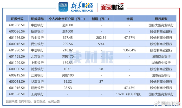 城商行中,截至2024年末,北京银行个人养老金来及开户突破170万户,上海银行养老金客户159.53万户。