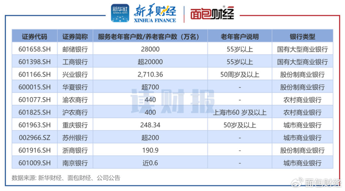 除此之外,股份制银行中,兴业银行服务50周岁及以上客户2710.36万户,华夏银行服务老年客群超700万户。农商行中,渝农商行养老客户超440万户,沪农商行服务上海市60岁及以上老年客户超400万人。