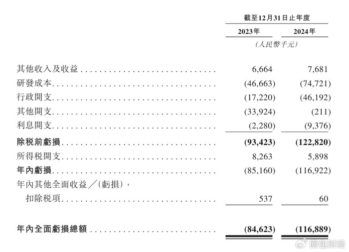 高额的亏损主要源于研发成本、行政开支等。2023年至2024年,公司研发成本分别为4666.3万元、7472.1万元,行政开支分别为1722.0万元、4619.2万元。