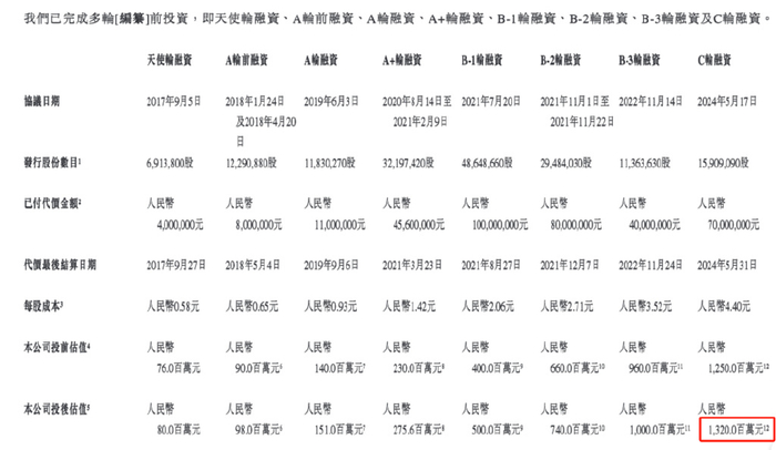 截至最后可行日期,承泰科技已累计募集资金超过3.5亿元。在2024年完成的C轮融资中,承泰科技投后估值约13.2亿元。