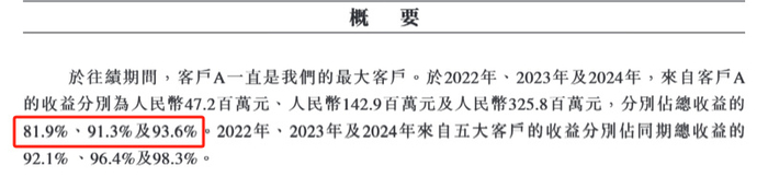 承泰科技的收入较为依赖单一客户。数据显示,在 2022 年、2023 年及 2024 年,公司来自客户 A 的收益分别为人民币 47.2百万元、142.9百万元及 325.8百万元,分别占总收益的 81.9%、91.3% 及 93.6%。
