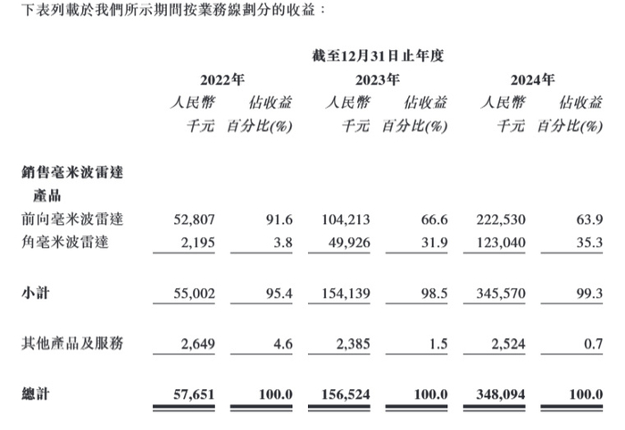 2024年,承泰科技来自前向毫米波雷达、角毫米波雷达的收入占比分别为63.9%、35.3%。