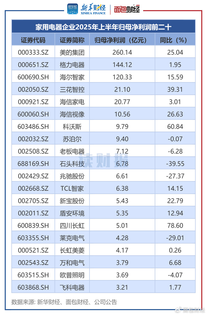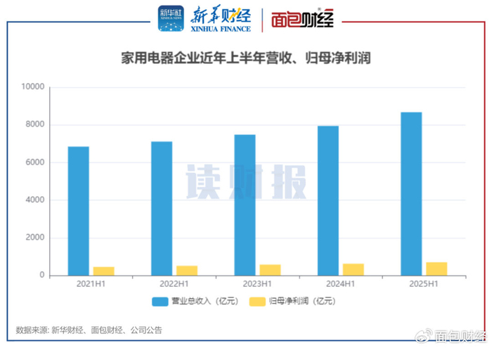 新华财经和面包财经研究员梳理公开资料显示,受益于国补等利好刺激,A股申万一级行业分类为家用电器的102家企业2025年上半年合计实现营收8673.8亿元、归母净利润701.12亿元,同比分别增长9.19%、12.79%。