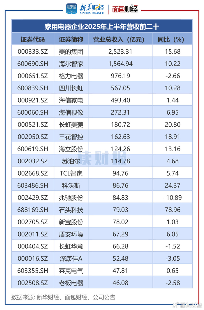 图2:家用电器企业2025年上半年营收前二十