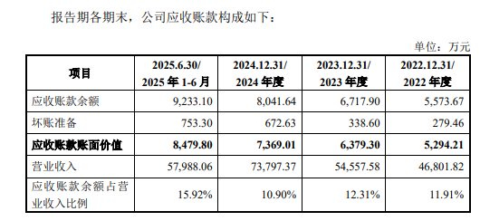 招股书显示,随着销售收入的增长,好盈科技的应收账款余额呈现上升趋势。2022年末至2025年6月末,公司应收账款余额分别为5573.67万元、6717.90万元、8041.64万元和9233.10万元。其应收账款余额在总营收中的占比由2022年11.1%提升至2025年上半年的15.92%。