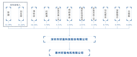 截至招股说明书签署日,张捷直接持有公司32.19%的股份,作为好盈共赢一号执行事务合伙人间接控制公司5.31%的表决权,作为好盈共赢二号执行事务合伙人间接控制公司2.19%的表决权;刘友辉直接持有公司31.26%的股份。张捷、刘友辉二人合计控制公司70.95%的表决权,共同作为公司的控股股东和实际控制人。
