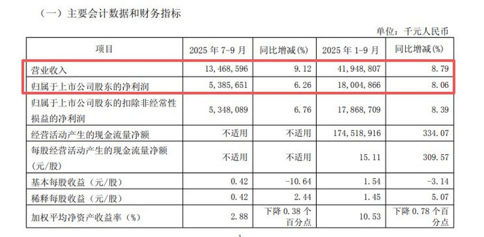 财报显示,2025年前三季度,南京银行实现营业收入419.49亿元,较上年同期增长8.79%;实现归母净利润180.05亿元,较上年同期增长8.06%。