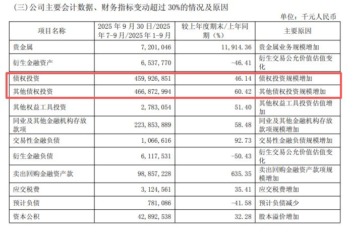而利息净收入的快速增长主要由于资产规模的快速扩张,尤其是金融资产中的债权类投资的大幅增长。财报显示,截至2025年9月末,南京银行总资产29623.1亿元,较上年末增长14.31%。其中贷款总额14114.81亿元,较上年末增加1550.83亿元,增幅12.34%。截至9月末,该行债权投资规模4599.3亿元,较上年末增加1452.2亿元,增幅46.14%;其他债权投资为4668.7亿元,较上年末增加1758.5亿元,增幅60.42%。上述两类债券投资合计达9268亿元,较上年末增长超53%,其增速远超总资产及总贷款增速。