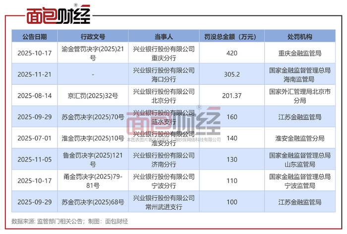 近期,兴业银行海口分行贷款管理不尽职等,被国家金融监督管理总局海南监管局罚没超300万元,并对多名相关责任人进行了处罚。2025年下半年以来,兴业银行已多次被监管部门处罚,累计收到超过25张罚单,总罚没金额超过2300万元。