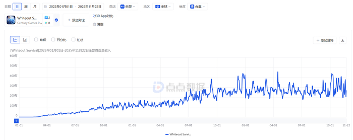 《Whiteout Survival》是全球首款冰雪题材策略类手游。根据点点数据的监测,《Whiteout Survival》(包括《无尽冬日》)来自全球iOS端的收入持续上升,最近1年保持稳定。