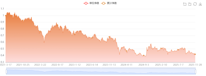截至2025年11月28日,从长期业绩表现来看,该基金成立4年多净值累计下跌58.07%,跑输基准逾60个百分点。