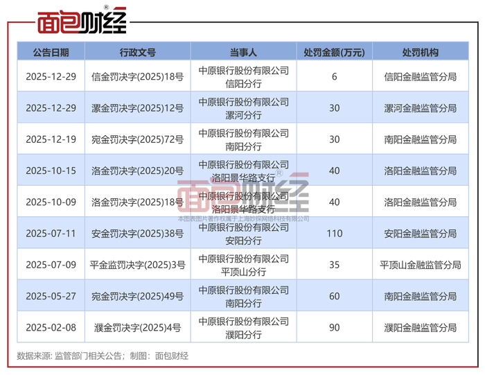2025年12月29日,中原银行连收两张罚单。统计数据显示,2025年以来该行累计被罚款441万元。