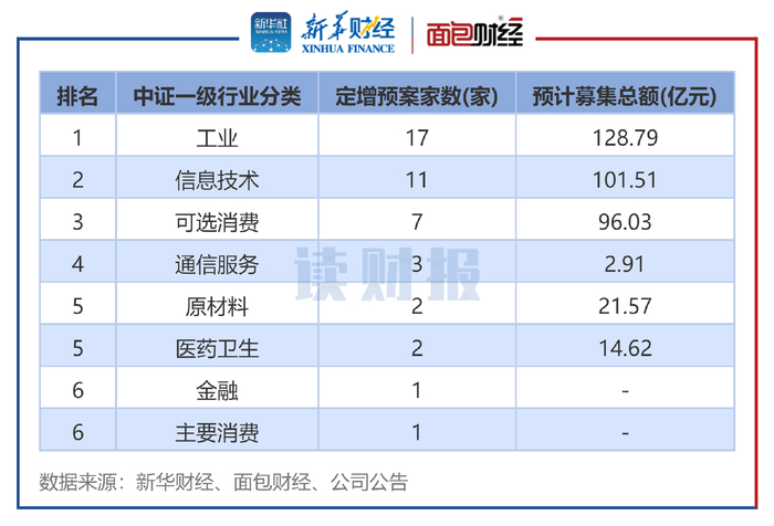 从行业分布来看,以中证行业统计,2025年12月,工业行业发布17起定增预案,拟募资额合计超128.79亿元;其次是信息技术行业,有11起定增预案;可选消费行业排名第三,有7起定增预案。