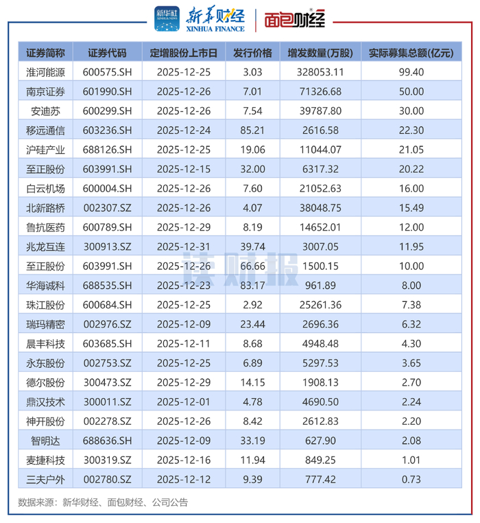 2025年12月实施定增的上市公司中,淮河能源的实际募资额排在首位。淮河能源新增股份数量为328053.11万股,发行价格为3.03元/股,实际募资总额为99.4亿元,募集资金净额拟用于购买淮南矿业持有的电力集团89.30%股权。