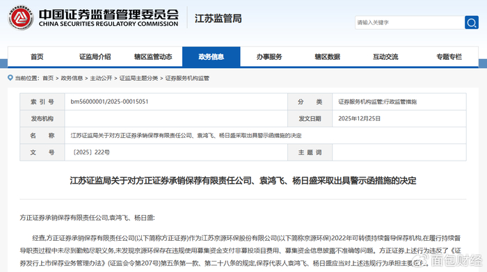 近日,江苏证监局披露关于对方正证券承销保荐有限责任公司、袁鸿飞、杨日盛采取出具警示函措施的决定(〔2025〕222号)。
