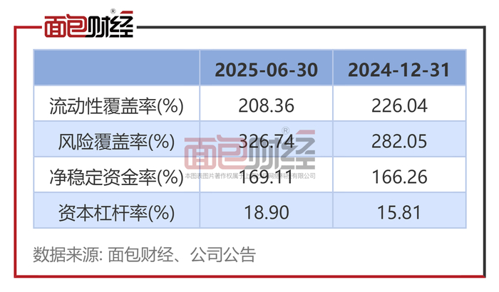 数据显示,2025年6月末,公司的流动性覆盖率为208.36%,较2024年末下降17.68个百分点;风险覆盖率为326.74%,较2024年末上升44.69个百分点;净稳定资金率为169.11%,较2024年末上升2.85个百分点;资本杠杆率为18.9%,较2024年末上升3.09个百分点。