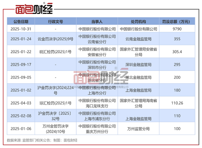 面包财经根据监管部门通报统计,2025年中国银行多次被监管部门处罚,累计罚没超1.4亿元,其中百万级大额罚单共计9张,以下为百万级以上罚单。