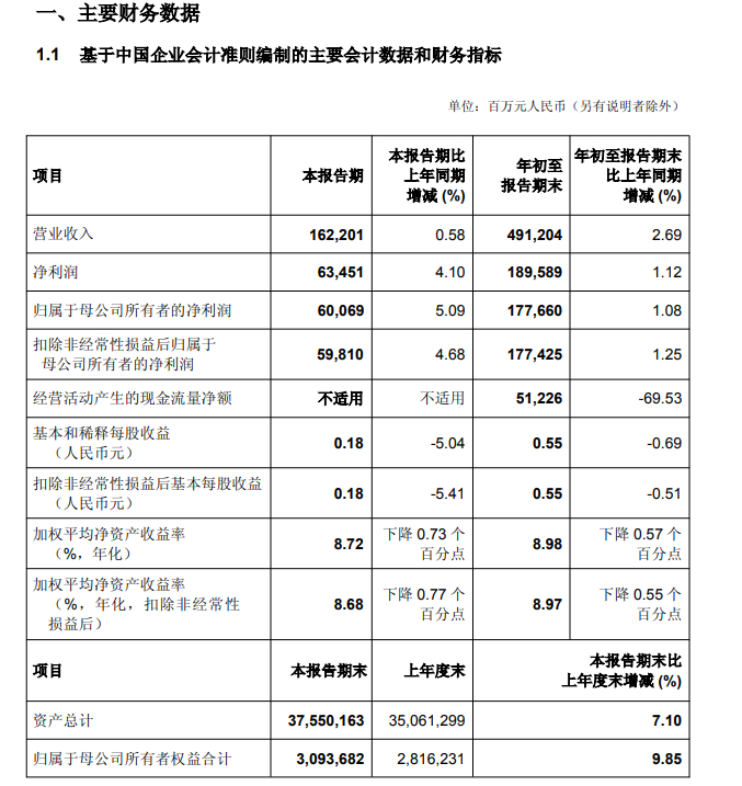 资产质量方面,截至2025年9月末,不良贷款总额2,886.69亿元,不良贷款率1.24%,较上年末下降0.01个百分点,不良贷款拨备覆盖率196.6%,比上年末下降4个百分点。核心一级资本充足率、一级资本充足率及资本充足率分别为12.58%、14.66%、18.66%。
