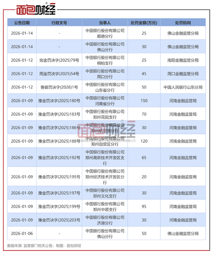 2026年1月14日,中国银行连收两张罚单,均涉及信贷业务违规。