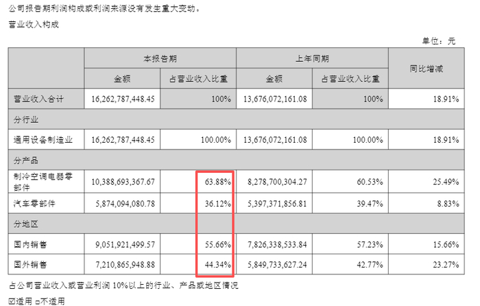 根据2025年半年报,三花智控来自制冷空调电器零部件、汽车零部件业务的收入占比分别为63.88%、36.12%。期间,公司约44.34%的收入来自于国外销售。