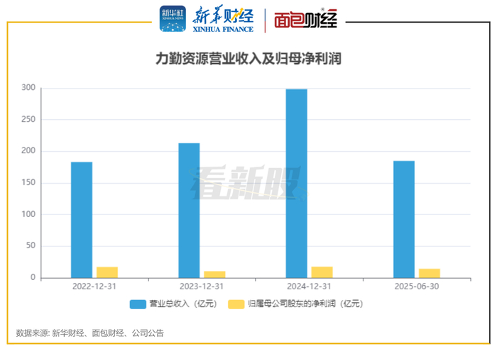 随着镍产品生产线的持续投产以及下游旺盛的市场需求,力勤资源的销售收入与盈利规模稳步增长。2022年至2025年上半年,公司的营业收入分别为183.19亿元、212.86亿元、298.46亿元和184.97亿元,归母净利润分别为17.3亿元、10.5亿元、17.68亿元和14.28亿元。