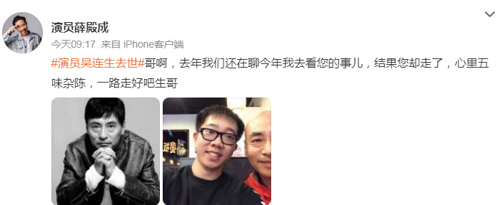 1 月 8 日,一则令人悲痛的消息在演艺圈传开。演员薛殿成在社交平台上公布了演员吴连生去世的噩耗。薛殿成感慨万分,回忆起去年还和朋友们兴致勃勃地计划着今年去看望吴连生,可如今故人已去,心中满是苦涩与不舍,只能默默祝愿吴连生一路走好。