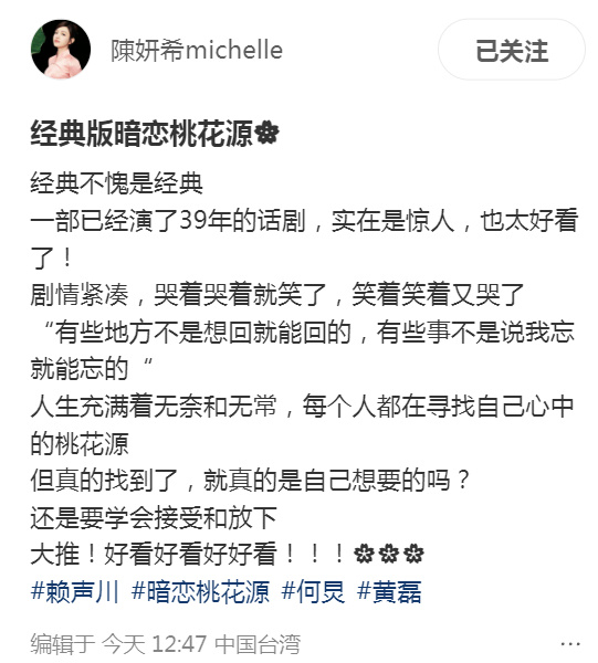 3月9日,陈妍希在离婚后首次发文,分享了观看话剧《暗恋桃花源》的感悟,还晒出与何炅、黄磊及赖声川夫妇的合照。