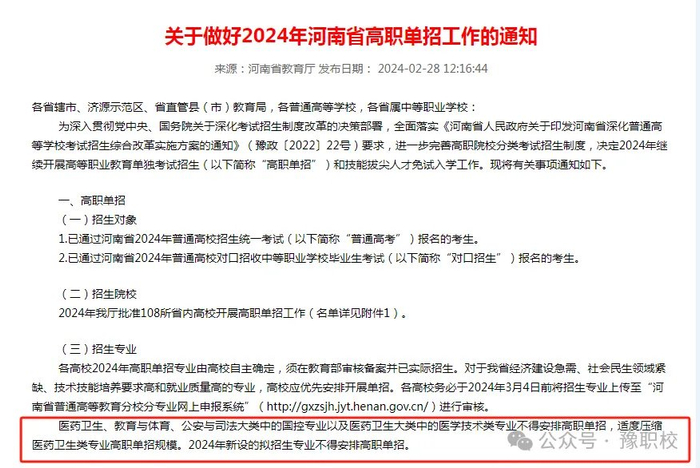 医药卫生、教育与体育、公安与司法大类中的国控专业以及医药卫生大类中的医学技术类专业不得安排高职单招,适度压缩医药卫生类专业高职单招规模。根据2024年新设的拟招生专业不得安排高职单招。