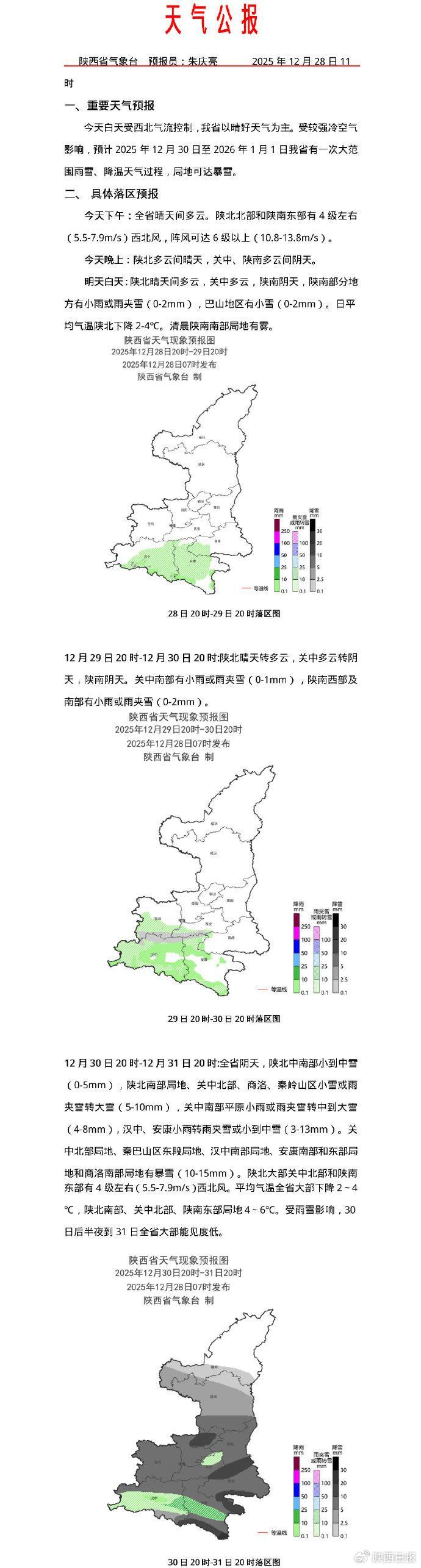 雨雪:30日夜间城区及平原地区阴天转小雨(0.5~3毫米),南部山区雨夹雪转小到中雪(1~4毫米)。31日上午城区及平原地区有小雨或雨夹雪,中午前后至夜间逐渐由雨夹雪转为小到中雪(累积降水量5~9毫米),南部山区大雪(5~8毫米),长安、蓝田山区局地暴雪(10~13毫米)。城区及平原地区积雪深度1~4厘米,秦岭山区积雪深度3~10厘米。