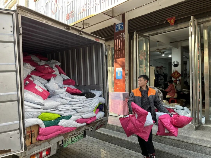 车间里,充绒、裁剪、封装……工人们正忙碌地赶制订单;车间外,申通快递小哥麻利地将打包好的货物装车,这些承载着温暖的包裹将发往全国各地。