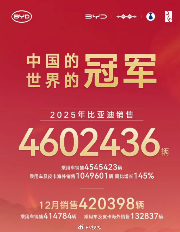 最新数据一出来,直接炸裂,比亚迪2025年全年总销量超460万辆,其中纯电车型狂卖225.67万辆,把特斯拉163.6万辆的纯电成绩远远甩在身后,稳稳坐上全球纯电销冠的宝座。