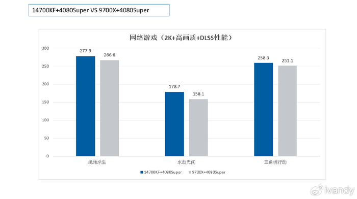 而在网络游戏中,Intel i7-14700KF同样和AMD 9700X表现的差不多的。两者的表现一样非常不错。所以把钱省下来去升级其它硬件就是最优的选择,这也是DIY的乐趣,每一样硬件都是最适合自己的,每一个硬件都可以把性能发挥到极致,这就是DIY玩家所追求的极致。