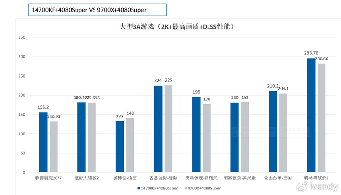 最先对比就是大型3A游戏,毕竟这是很多游戏玩家最喜欢的作品,这些3A大作都一堆发烧友会去二刷三刷,把游戏支线都玩个透,大家可以图过图表来看,两都最后的表现都差不了多少,可以说是不分伯仲,而这时Intel i7-14700KF的性价比就更加凸显了。毕竟intel在普通用户心中就是稳定的代名词。