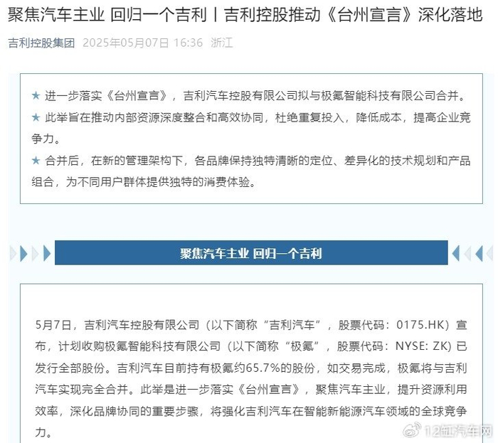 5月7日,吉利汽车突然发布推文称,“计划收购极氪智能科技有限公司已发行全部股份。吉利汽车目前持有极氪约65.7%的股份,如交易完成,极氪将与吉利汽车实现完全合并”。