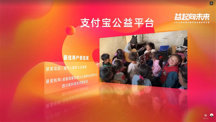 四川省科技扶贫基金会与成都高新区萤火公益事业发展中心联合开展的“留守儿童的七彩假期”项目,获得支付宝公益平台“最佳用户责任奖”。