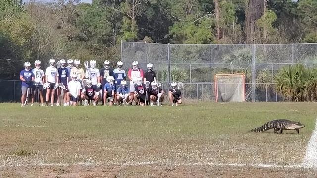 这是一个神奇的画面,一只鳄鱼出现在美国一所高中的操场上,打断了一群高中生的训练。