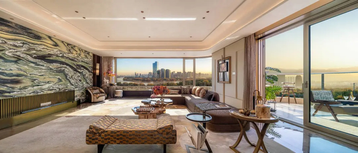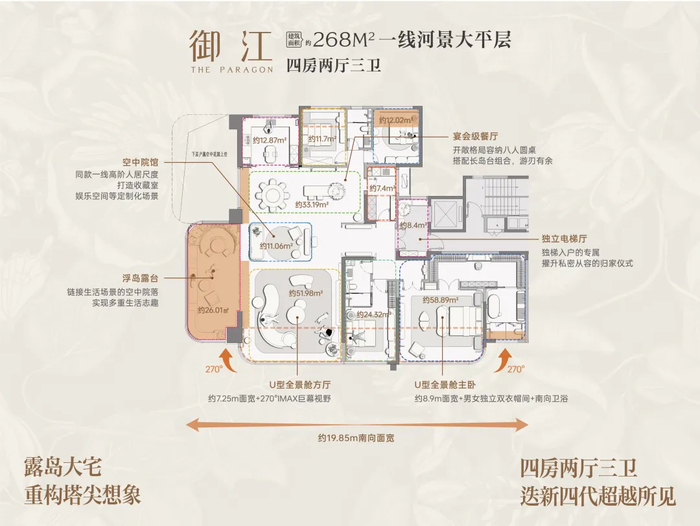 中海·天钻建面约268㎡户型直接砸出41.95m连续景观面,覆盖客厅、主卧、空中露台等核心场景。U型全景客厅+U型全景主卧打造的270°环幕视野,直接把“黄河观景台”搬进家——春天看黄河岸新绿抽芽,夏天吹河风赏碧波,秋天揽霞光染河面,冬天看银装裹静流……